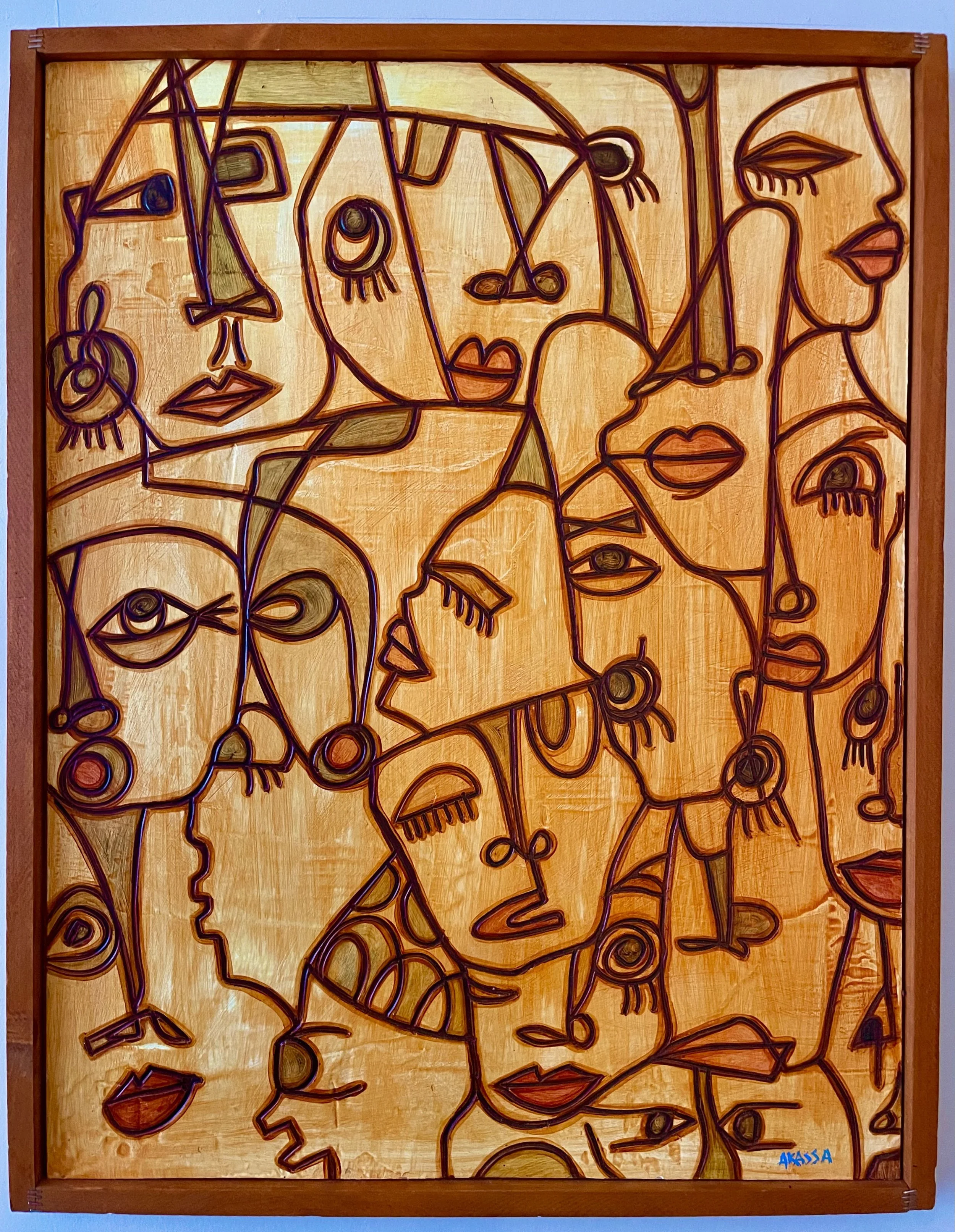 As he frequents Union Square, Akassa regularly stands among a wide variety of people. They pass before him, all ranging in their expressions, mood, and energy. However, despite these ostensible differences, there is commonality. In recognition of our shared humanity, Akassa brings everyone together in this swirling composition that stylistically draws from his Senegalese roots. He captures our entropy and puts it on the canvas, as he symbolizes our unity through the uniformity in color. The work itself is not only a call to celebration of everyone who comprises the human race, but a reflection of what it means to live the human experience.